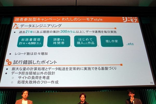 例えば昨年には、コミックシーモアの20周年記念として、読者が利用年数や総読書冊数、読書傾向などを振り返ることができる専用サイト「わたしのシーモアstyle」を立ち上げた。21年間×4000万人分のデータは莫大な量であり、日々、データ連携が実施される。
