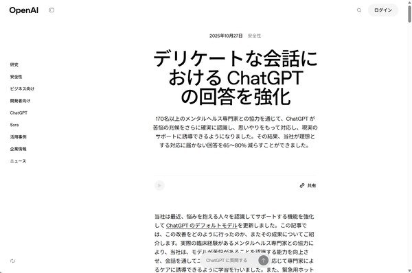 しかし、技術の進歩は必ずしも明るい未来だけを実現したわけではなかった。2025年には米国でChatGPTを利用した10代の複数ユーザーが自殺に至ったと報道された。AIが持つ共感性のリスクが浮き彫りになり、悲劇の引き金になったという。現在は、専門家と連携し、より安全にChatGPTを使えるようになっている。