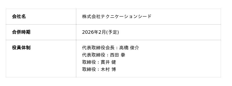本合併により、両社は2026年2月(予定)をもって、「株式会社テクニケーションシード」に社名を変更いたします。