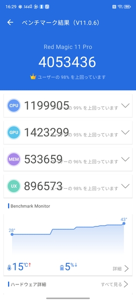 スマホのSoCは高温になると、動作周波数を下げる仕組みが入っていますが、この冷却システムにより、ゲームによる高負荷な状態でも高性能を維持できます。メーカー公称では、従来モデルと比べて、放熱効率が約120%向上し、温度も最大6度下がるとしています