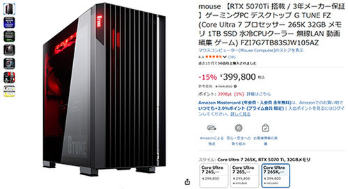 マウスコンピューターのデスクトップゲーミングPC「G TUNE FZ(FZI7G7TB83SJW105AZ)」が、Amazonセールに登場しました。参考価格469,800円のところ、15%オフの399,800円で販売中です。