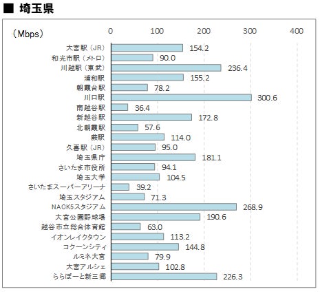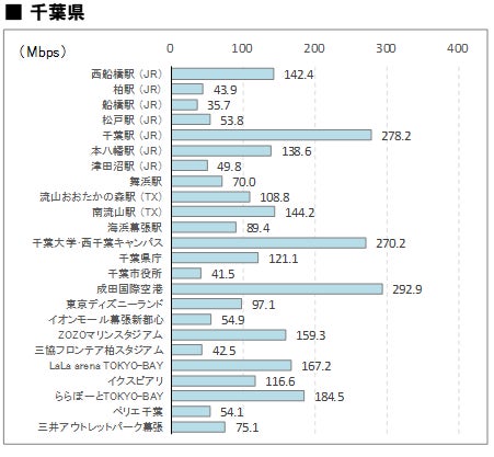 測定地点ごとに見ると、今回調査における下り通信速度の最速地点は神奈川県のラゾーナ川崎プラザであり、4社平均下り通信速度は312.6Mbpsであった。川口駅(300.6Mbps)、成田国際空港(292.9Mbps)、目黒駅(290.7Mbps)、メルカリスタジアム(282.7Mbps)と続いた。一方で、4社平均の下り速度が最も遅かったのは、渋谷スクランブル交差点(27.9Mbps)であった。他に40Mbpsを下回った地点は、横浜駅(32.8Mbps)、船橋駅(35.7Mbps)、南越谷駅(36.4Mbps)、さいたまスーパーアリーナ(39.2Mbps)、横浜市役所(39.5Mbps)である。関東地方は、4社平均下り速度が300Mbpsを超える地点数が関西地方よりも少ないが、40Mbpsを下回る地点も関西地方よりも少ない結果となった。