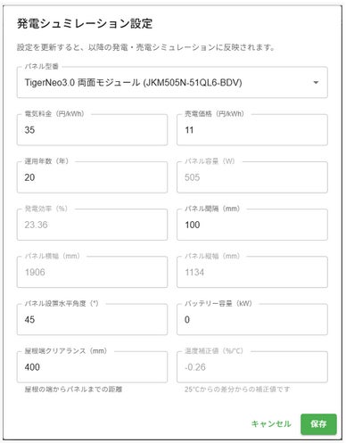 ・太陽光パネルの温度補正値(気温寒暖差等によるパネルの温度を加味した補正)も設定できるようになりました。