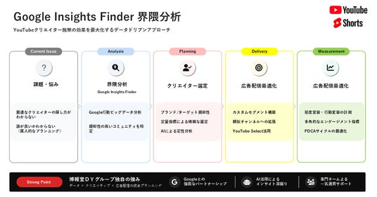 こうした背景から当社は、YouTubeのインフルエンサーマーケティング施策において、Google Insights Finderから得られる分析データと、これまで培った企画力やディレクションにおけるナレッジ、幅広いキャスティングネットワークを掛け合わせた支援をおこなうサービスの提供を開始しました。本サービスは客観的な根拠にもとづき、企業のブランドに最も適したクリエイターの選定から、メディアプランニング、広告配信・運用までワンストップで支援します。