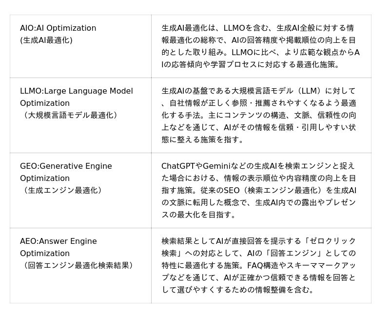 現在、AI検索最適化の分野は、「AIO」「LLMO」「GEO」「AEO」など、名称や定義の異なる概念や手法が多数存在します(各名称の説明は以下のとおり)。当社はこれらを統合的に捉え、「生成AI時代における企業情報の戦略的コントロールと可視性の最適化」を目的としたサービスを提供しています。