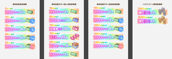 さらに、「事前登録者数」「個人回転数」「総回転数」「ハウスコイン獲得量」に応じて、合計40連分以上のガチャチケットや豪華ゲームアイテムなどがもらえる。詳細は公式サイトを確認してほしい。