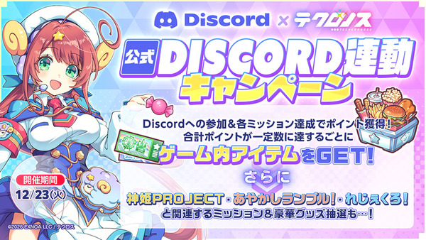 Discordで実施されるミッションをクリアすることで、ゲーム内アイテムや限定グッズがもらえるキャンペーンを開催中。また、『神姫PROJECT』『あやかしランブル!』『れじぇくろ!』と関連するミッションも実施予定だ。