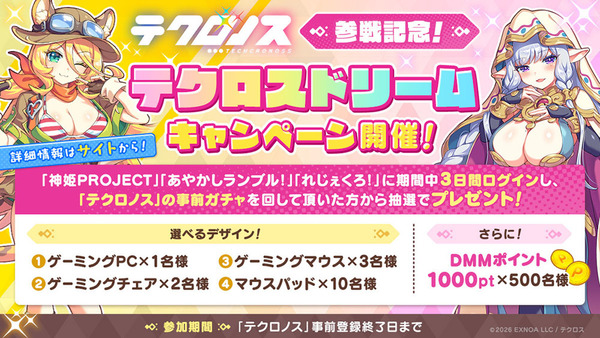 事前登録期間中、『神姫PROJECT』『あやかしランブル!』『れじぇくろ!』に合計3日間以上ログインし、『テクロノス』事前ガチャを回した人から、選べるデザインのゲーミングPCやDMMポイントなどを抽選でプレゼント。