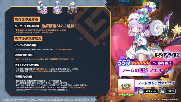 ノエルを開花させることで、★6ランクに進化し、イラストやドット絵の変化、ステータスの強化や覚醒ノードの追加、さらにリーダースキルの使用が可能になる。