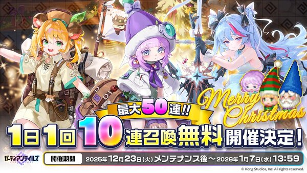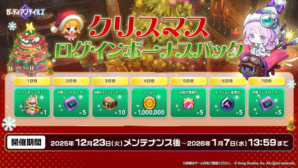さらに、イベント期間中は「クリスマスログインボーナスパック」の配布も実施。7日間ログインすると合計10連分の召喚アイテムや、役に立つアイテムが多数獲得できる。開催期間は、2026年1月7日13時59分まで。