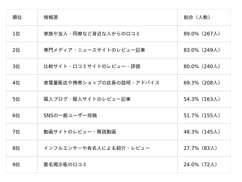 最も頼りにされるのは、「家族や友人・同僚など身近な人からの口コミ(30.0%)」で、次いで「専門メディア・ニュースサイトのレビュー記事(23.3%)」「比較サイト・口コミサイトのレビュー・評価(18.7%)」が続きました。