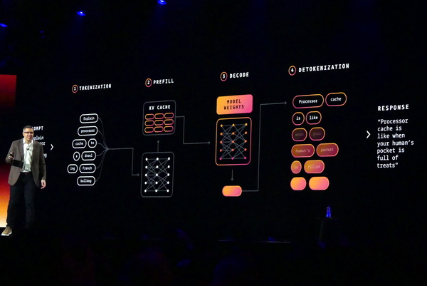 推論はなぜ難しいのか? 推論のワークロードは、入力されたプロンプトをモデルが理解できるようにする「トークン化(Tokenization)、プロンプト全体を維持しながら、モデルがコンテキストを理解できるようにキーバリューキャッシュを生成する「プリフィル(Prefill)」、キーバリューキャッシュを参照しながら、レスポンスを1トークンずつ生成する「デコード(Decode)」、トークンを人間のわかる自然言語に変換する「デトークン(Detokenization)の大きく4つから構成されている。