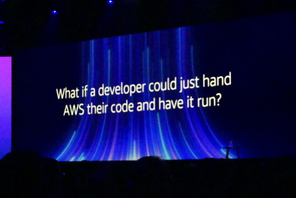 続く話は再び2013年にさかのぼる。とあるAWSのエンジニアが思いついたのは、「開発者がAWSにコードを渡すだけで実行できるようになったらどうだろう?」というアイデアだ。サービスも、実行環境も、プロビジョニングも、スケールもない環境で、コードが動く。「このアイデアを思いついたのは、Amazon EC2以外のメンバーだ。サーバーを担当しているメンバーは、そもそもサーバーがなかったら、という思いつきはできない。目的はサーバーを簡単にするのではなく、体験からサーバーを完全に取り除くことだった」とブラウン氏は語る。