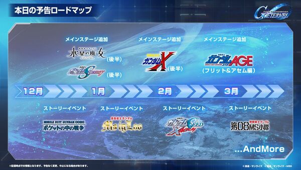 2月以降もストーリーイベント「機動戦士ガンダムSEED X ASTRAY」の開催や、メインステージ「機動戦士ガンダムAGE」(フリット&アセム編)、ストーリーイベント「機動戦士ガンダム 第08MS小隊」の追加を予定している。