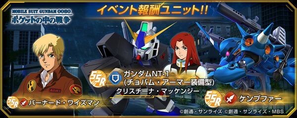 まず、12月24日からはストーリーイベント「機動戦士ガンダム0080 ポケットの中の戦争」が開催。作中の時期に合わせた「クリスマス」イベントとなる。報酬として「ガンダムNT-1(チョバムアーマー装備型)」などがもらえる。OVAの楽曲「いつか空に届いて」なども流れるので必聴だ。