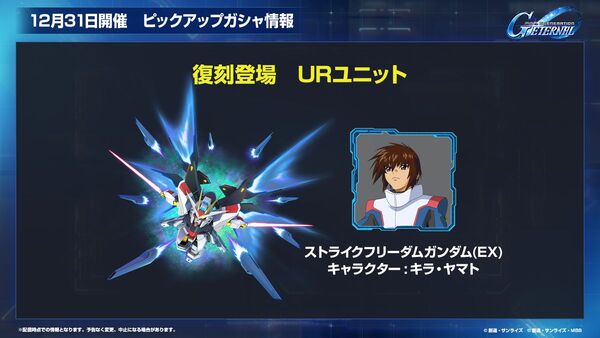12月31日からはメインステージに「機動戦士ガンダムSEED DESTINY」(後半)と、「機動戦士ガンダム 水星の魔女」(後半)が追加。期間限定ユニットとしてUR「ガンダム・キャリバーン(最終決戦時)(EX)」と、UR「デスティニーガンダム(EX)」が登場する。