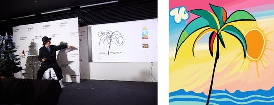 招待客から事前に募集したテーマの中からランダムに選ばれたお題に沿って、Samsung Galaxyを使用した即興アート制作に挑戦するアートワークショップ体験が行われました。木梨さんがその場で描き上げたスケッチにGalaxy AIのスケッチアシスト機能「AIスケッチ」を活用することで、簡単かつ表現豊かなアート作品へと仕上がりました。