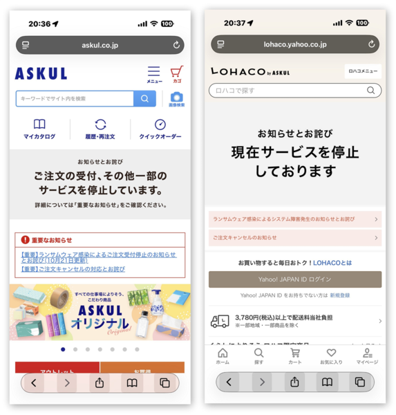 一方、アスクルは70万件以上の個人情報などが流出したほか、自社通販サイトに加えてアスクルのグループ会社にサービスの一部を委託していた良品計画(無印良品)・ロフトなどのネットストアも停止しています。その後、徐々に再開されており、無印良品ネットストアも12月15日から全商品の受注・出荷を始めました。