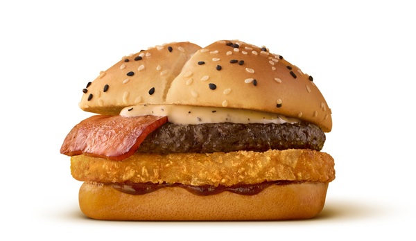 肉厚ビーフとポテトパティに、香ばしい炙り醤油風ソースと、コンソメとガーリックの旨みにブラックペッパーのスパイス感がきいたマヨソースが相性抜群としています。ボリューミーな一品。