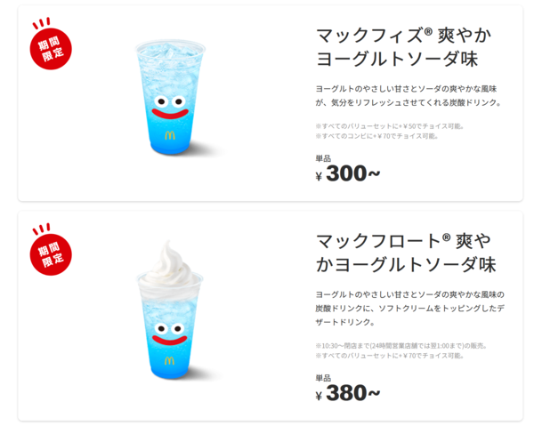 また、ヨーグルトとソーダ味のドリンク「マックフィズ 爽やかヨーグルトソーダ味(300円~)」、「マックフロート 爽やかヨーグルトソーダ味(380円~)」も同時に発売。ドリンクは鮮やかな青色で、カップにはスライムの顔が描かれている。