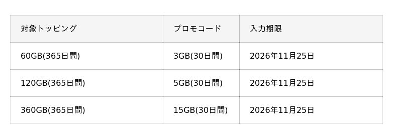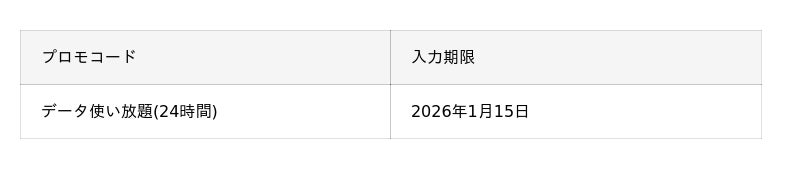 2025年12月25日から12月31日まで、対象トッピングのデータ容量を料金据え置きで、「データ使い放題(24時間)」のプロモコードがついてくるキャンペーンを実施します。さらに、対象の1年間トッピングなら追加のデータボーナスがもらえる、おトクなキャンペーンです。