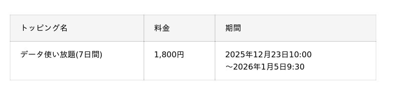 2025年12月23日から2026年1月5日まで、「データ使い放題(7日間)」を提供します。年末年始のお出かけ時のデータ使用量を気にせずご利用いただけます。