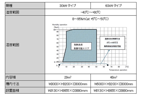今回発売するウォークインチャンバーはAIサーバー稼働時を想定した発熱負荷(30kW、60kW)に対して、独自の制御システムにより精密に温湿度制御を行い、サーバーの信頼性評価に関する試験規格ASHRAEに適合した試験を実施することが可能です。また、新たに採用した空気循環方式により、AIサーバーの排熱による試験への影響を低減し、試験室内の均一な温湿度環境を実現すると共に、槽内の排熱が室内に滞留することなく効率良く試験を行うことが可能です。さらに、新たに開発した空調システムを搭載し、装置の消費電力を抑えると共に、省スペース化を実現しました。本製品により、発熱量の高い高性能半導体や電源を搭載するAIサーバーの信頼性確保に貢献します。