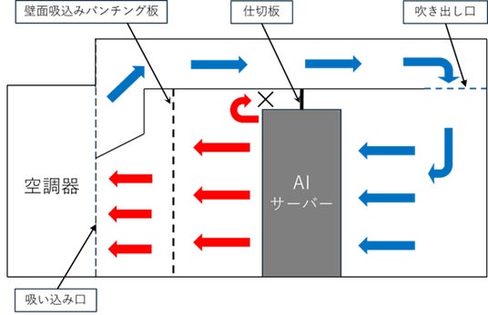 槽内空気の循環方式について、天井部にダクトを設けAIサーバーの吸込みエリアに吹き出し口を装備し、合わせてサーバー前後のエリアを区切る仕切板を設置しました。これにより、サーバーから発生した排熱の回り込みを防止しサーバーの吸込み温度分布を均一に保つことができ、試験規格に適合した試験を行うことが可能です。また、空調器の吸い込み部の壁全面にパンチング板を装備することで槽内の排熱を滞留することなく効率的に回収できる構造を実現しました。