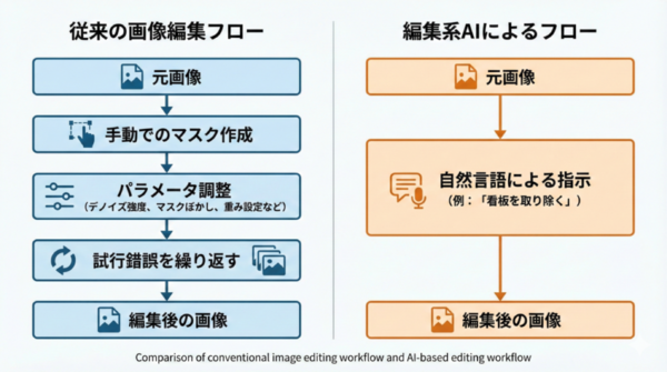 従来の画像生成AIは、白紙のキャンバスに対してテキストから画像を生成するT2I(テキストtoイメージ)が中心だった。一方で編集系AIは、すでに存在する画像を前提とし、不要な要素の削除や差し替え、背景の拡張、文字の書き換えといった処理をする。