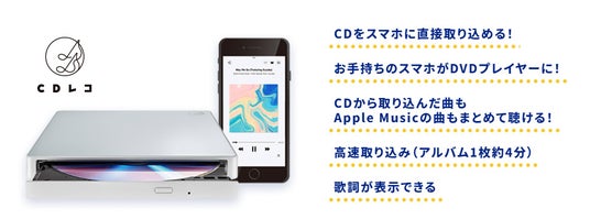 「CDレコ(CDレコ5v)」は、iPhoneやAndroidスマホ、ウォークマン(R)に音楽CDの曲を入れられるスマホ用CDレコーダーです。