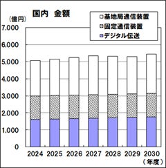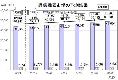 2025年度の通信機器の需要総額は4兆6,938億円(前年度比1.5%増)、そのうち国内は4兆4,205億円(同1.6%増)、輸出は2,733億円(同0.2%減)と予測しました。