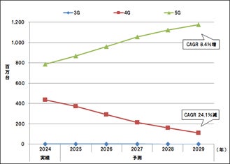 - 世界の携帯電話(スマートフォン含む)市場は、先進国を中心に5Gサービスが普及しており、2025年以降はより広範囲に5Gサービスが展開されるようになると想定されます。通信方式別では、今後発売されるスマートフォンの多くが5G対応になると予測されることから、5G対応のスマートフォン市場は拡大します。一方で、5G非対応のスマートフォン市場は、3Gからの移行需要は一定程度残るものの、5Gへの置き換えが急速に進んでおり、縮小すると予測しました(図表3.)。