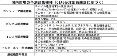 - 国内市場予測では、CIAJ受注出荷統計の過去実績から傾向を分析し、全体的な市場規模が捉えきれない機種では、(株)情報通信総合研究所の協力により、CIAJ会員へのヒアリング等を実施して推定しています。