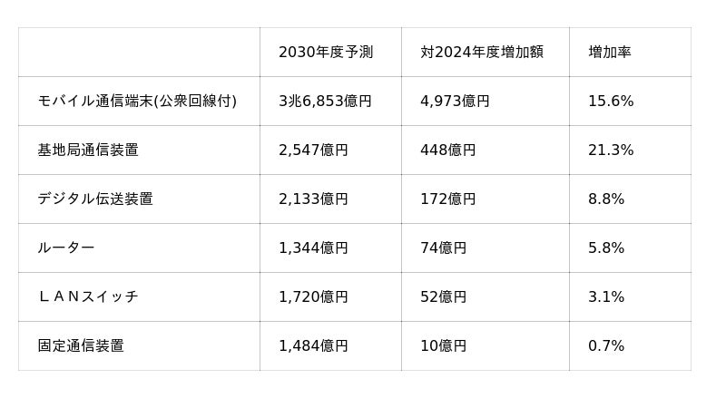 2030年度の通信機器市場の総額は5兆1,307億円(2024年度比10.9%増、CAGR 1.7%)、国内金額4兆8,676億円(同11.9%増、CAGR 1.9%)、輸出金額2,630億円(同4.0%減、CAGR -0.7%)と予測しました。