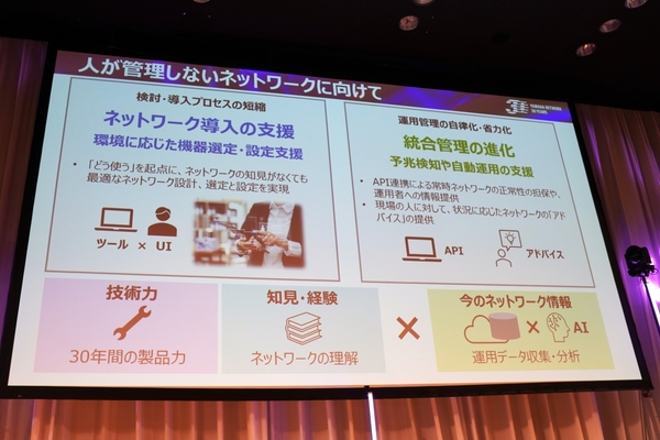 こうした現状を受け、ヤマハでは「検討・導入プロセスの短縮」と「運用管理の自立化・省力化」を進めている。ヤマハが30年間培ってきた技術力と知見・経験にAIの力を掛けあわせて、ネットワーク導入の支援および予兆管理や自動運用などによる統合管理の進化を図っていく。