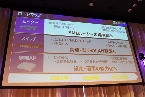 ハードウェアの拡充が進むスイッチでは、高速化に加え、管理性・信頼性の向上など満遍なく強化を図る方向性だ。今後、LANマップ拡張やYNOログ分析対応が控えている。
