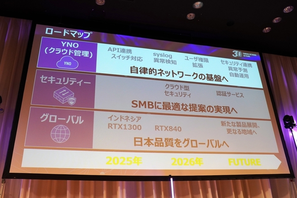 一方、クラウド管理サービスのYNOは、今後注力する自律的ネットワークの基盤としての役割を担う。今後は、外部サービスと連携する上での利便性を向上させていくとともに、自動運用のための機能を実装していく。セキュリティに関しては、中堅中小企業に最適なクラウド型セキュリティ機能を開発中であり、将来的には認証サービスに踏み込むことも視野に入れているという。