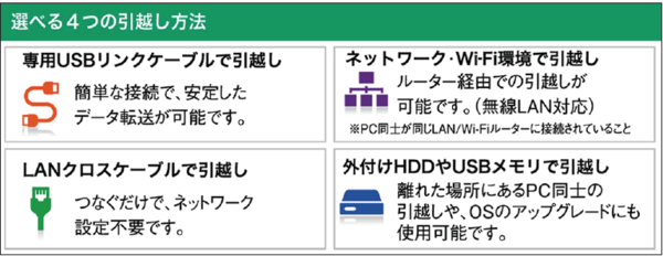 データの引っ越し方法はケーブル以外にも、外付けストレージやネット、LANクロスケーブルを使っても可能です。便利ですね。
