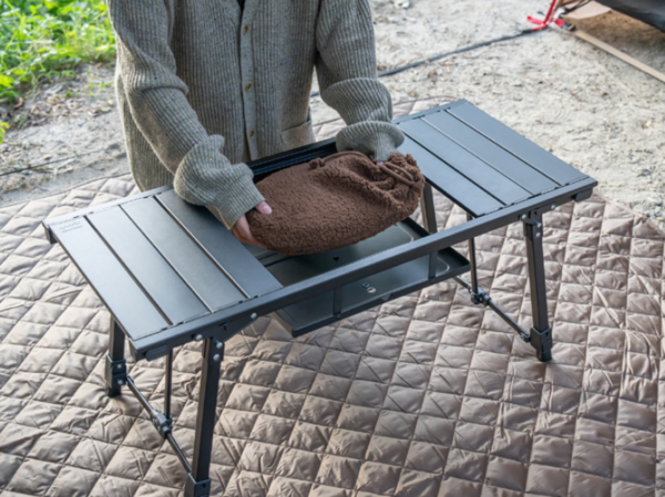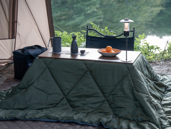 もともと同ブランドの「アルミユニットテーブル88」のオプションとして登場しましたが、サイズなどの条件が合えば、どんなテーブルでもOK。天板(86×39cm)は、折り畳んで専用袋に収納可能。布団も丸めて収納できます。冬のキャンプだけでなく、自宅でも使えるので、手軽に〝ぬくぬく空間〟が作り出せます。
