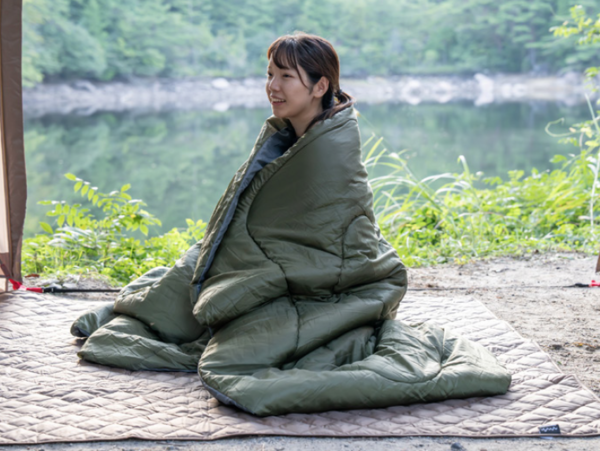 こたつ布団は、大きくて暖かいので、ブランケットやシュラフ代わりに使うのもオススメ。撥水加工が施され、汚れにも強いです。