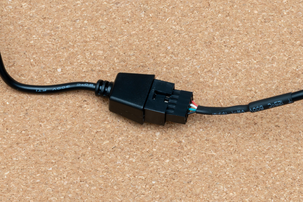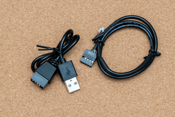 付属品を確認すると、接続するUSBケーブルは、ケース内部への設置と外付けの両対応になっていた。ケーブルの長さは、ディスプレーに接続する端子と内部USB2.0ヘッダーピンケーブルの内部用が約55cm。外付け用でUSB2.0ヘッダーピンコネクターからUSB Type-Aポートに変換するケーブルが約30cm(内部用と合わせて85cm)となっている。