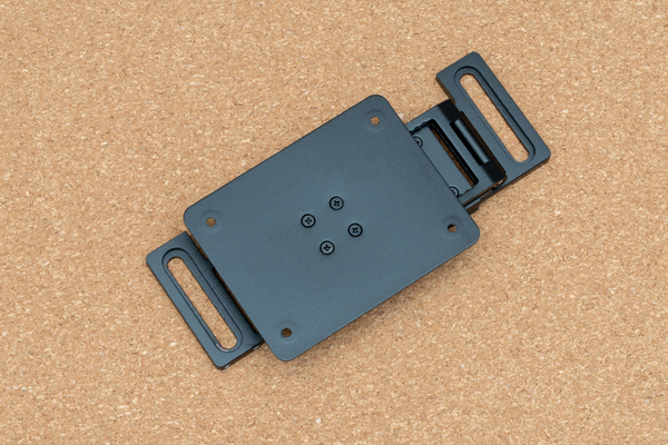 ブラケットは、ディスプレーの中央と左右の3ヵ所に取り付けできる。ブラケットのスライドレールと合わせて、ディスプレーを付ける位置の自由度は高くなっている。なお、ここの固定用ネジは小さいうえ、締めづらいので、なくさないように注意したい。