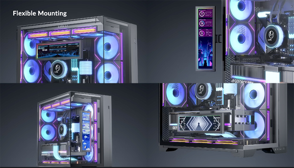 Lian Liの紹介動画にもあるが、ケース内にディスプレーを収めるスペースを確保できれば、ピラーレスケースのフロントサイドファンからトップ(ラジエーターファン)、ボトム、リアまで好みに合わせて置ける。