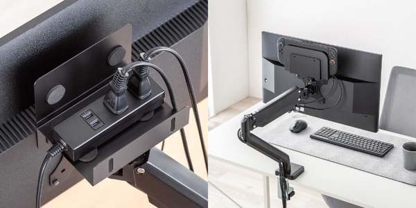 このホルダーはモニターアームと併用することで、画面の位置を自在に調整しつつ、背面には必要な機器を整理して設置可能だ。これにより、作業効率の向上と快適なワークスペースの実現が期待できる。クッション付きの設置面とスチール製の堅牢な構造により、大切な機器をキズから守りつつ、総耐荷重3kgまでの駆動をサポートする安心の設計だ。