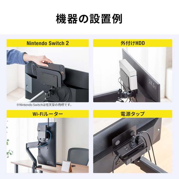 モニター背面を最大限に活用する「100-VESA011」は、デスク周りをすっきりと整理するための便利な製品だ。VESA規格対応で、多くの液晶ディスプレイやテレビに簡単に取り付けられるという。挟む・置くの2WAY構造が特徴で、外付けHDDや小型PC、Nintendo Switchといった機器を、モニターの背面にスマートに収納できる。