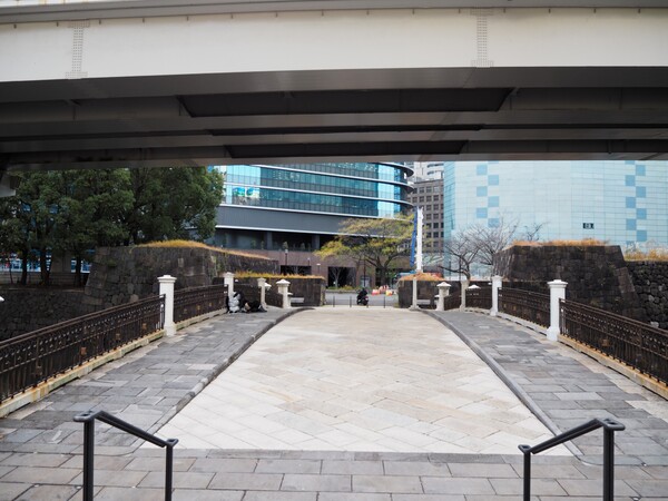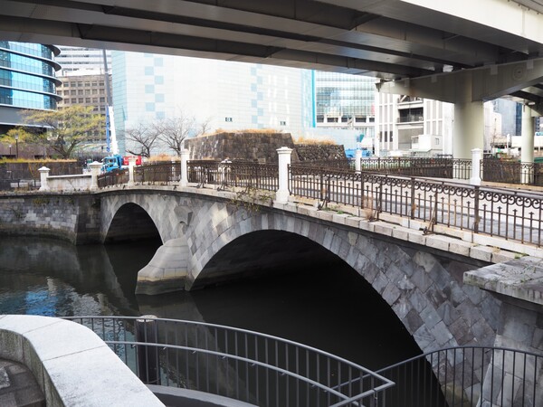 ビル群を通る外堀通りを5分ほど歩くと、左手に白っぽい橋が見えてきました。名前は「常磐橋(ときわばし)」。大きな橋ではありませんが、白い石造りと2連のアーチが優美な趣で、なにやら普通の橋とは少し違う雰囲気が漂っています。しかも車は通れず、歩行者専用の橋のようです。