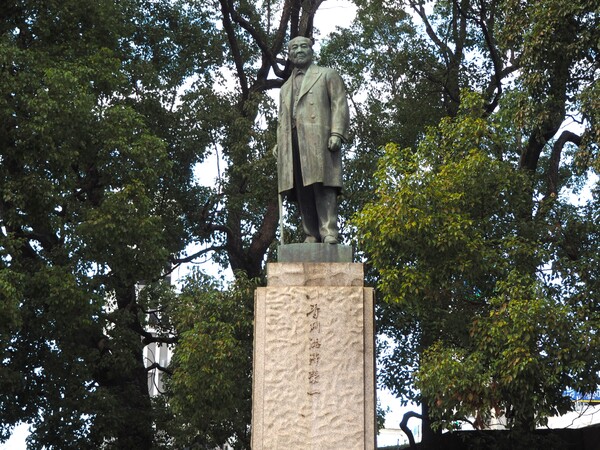 「常盤橋公園」では、あの有名な人物の銅像にも遭遇しました! 日本の近代経済の礎を築き、新しい一万円札の肖像画やNHK大河ドラマでもおなじみの渋沢栄一です。見上げるほど高い台座に、コートを羽織った洋装の全身姿で立っていて、なかなかりりしい姿です。でも、なぜこんなところに…?