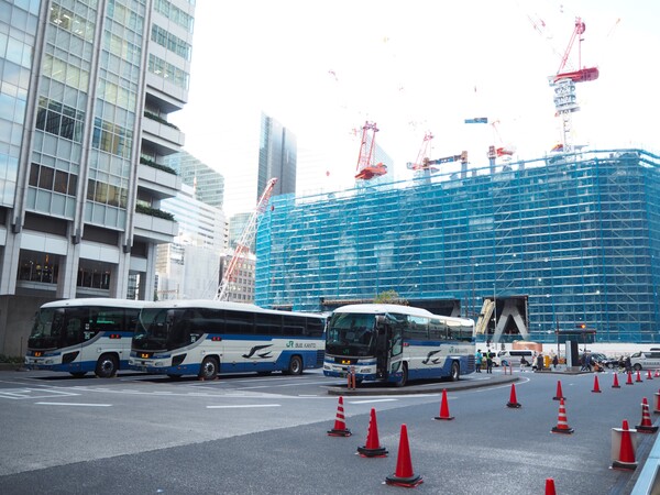 スタート地点は、JR東京駅の一番北側の出口「日本橋口」。ここを出て北方面へ向かってみました。バスロータリーの向こうでは現在、一大複合施設「TOKYO TORCH」の「Torch Tower」を絶賛建設中! 日本一の高さ390メートルの建物となり、ホテルやオフィスなどが入居するということで、このあたりは今後の注目エリアになりそうですね。