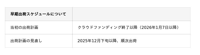 早期出荷に関しては、支援者順の発送となります。出荷の際に支援者各自にご案内をいたしますので、出荷案内をお待ちください。なお、出荷に関する個別の回答の受付ができません。あらかじめご了承ください。