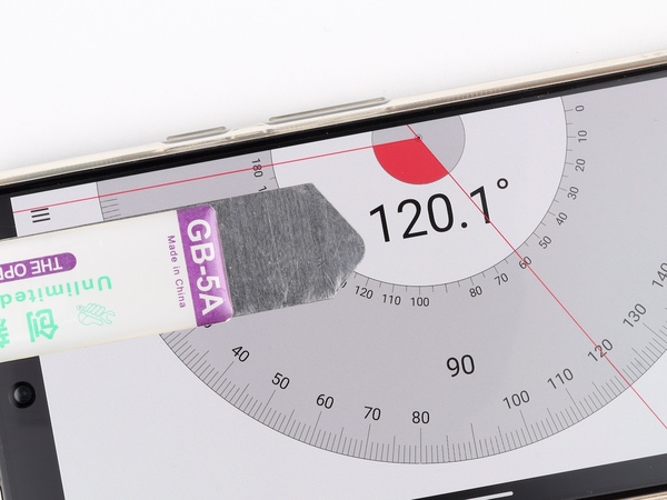 続いて面白かったのが、「スマート・ルーラーPro」の「分度器」機能。この分度器には2種類あって、1つはタップした位置の角度を表示してくれるというもの。定規機能と同じく、画面上に載せた物体の角度を測るのに便利な機能です。